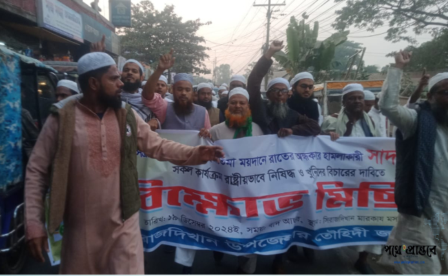 বৃহস্পতিবার (১৯ ডিসেম্বর) বিকাল সাড়ে ৪টার দিকে উপজেলার জোবায়ের পন্থীদের উদ্যোগে তাবলীগ জামায়াতের সাথীদের ওপর সাদপন্থীদের হামলা ও পরিকল্পিত হত্যাকান্ডের বিচারের দাবিতে বিক্ষোভ মিছিল অনুষ্ঠিত হয়।