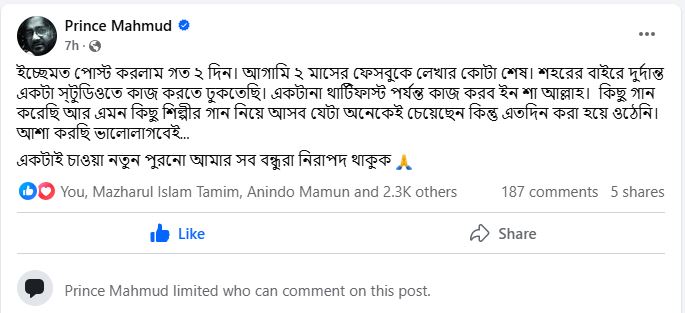 ফেসবুকে দেয়া এক পোস্টে প্রিন্স মাহমুদ জানান, ইচ্ছেমতো পোস্ট করলাম গত দুদিন। আগামী ২ মাসের ফেসবুকে লেখার কোটা শেষ। শহরের বাইরে দুর্দান্ত একটা স্টুডিওতে কাজ করতে ঢুকতেছি। একটানা থার্টিফার্স্ট পর্যন্ত কাজ করব ইনশাআল্লাহ। কিছু গান করেছি আর এমন কিছু শিল্পীর গান নিয়ে আসব যেটা অনেকেই চেয়েছেন কিন্তু এতদিন করা হয়ে ওঠেনি। আশা করছি ভালো লাগবেই।