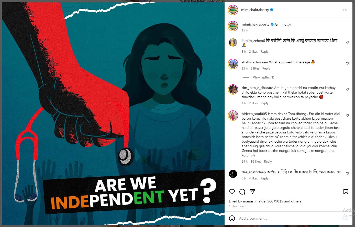 এদিকে মেয়েদের ‘রাত দখল’র অভিযানের পরদিন ১৫ আগস্ট ভারতের স্বাধীনতা দিবস। আর মহান এই দিবসেই বিস্ফোরক প্রশ্ন তুললেন মিমি চক্রবর্তী। সোশ্যাল মিডিয়া ইনস্টাগ্রাম হ্যান্ডেলে এ অভিনেত্রী লিখেছেন, ‘আমরা কি সত্যিই স্বাধীন?’