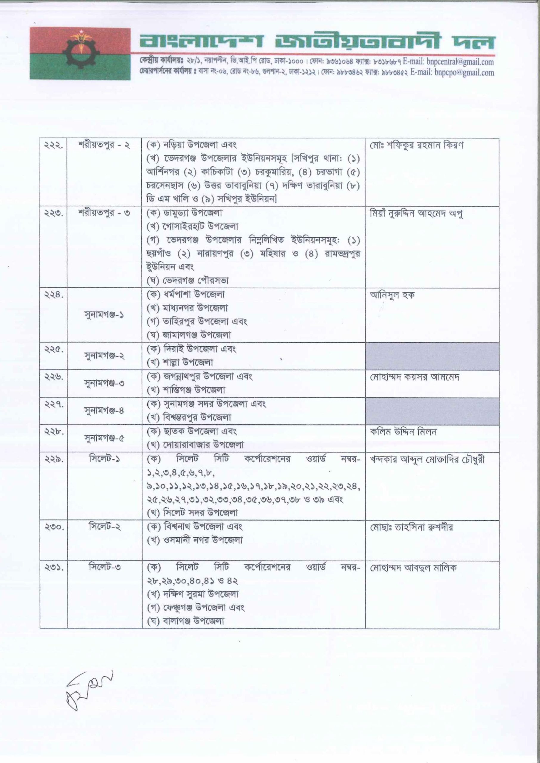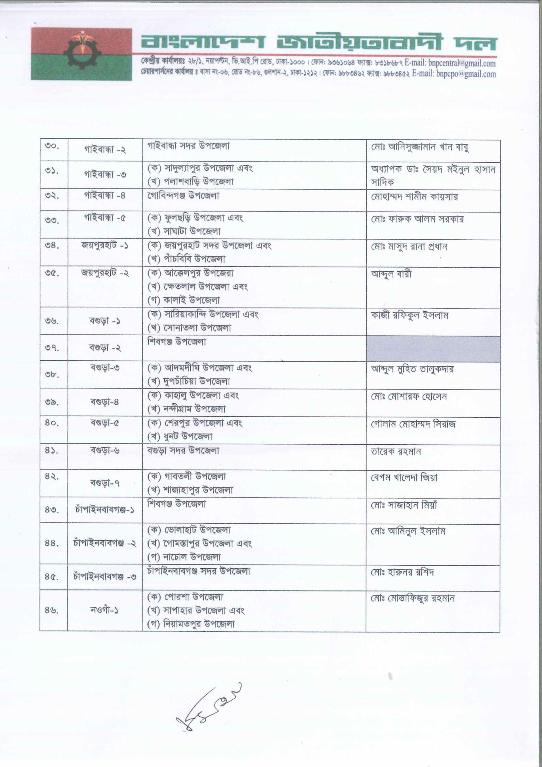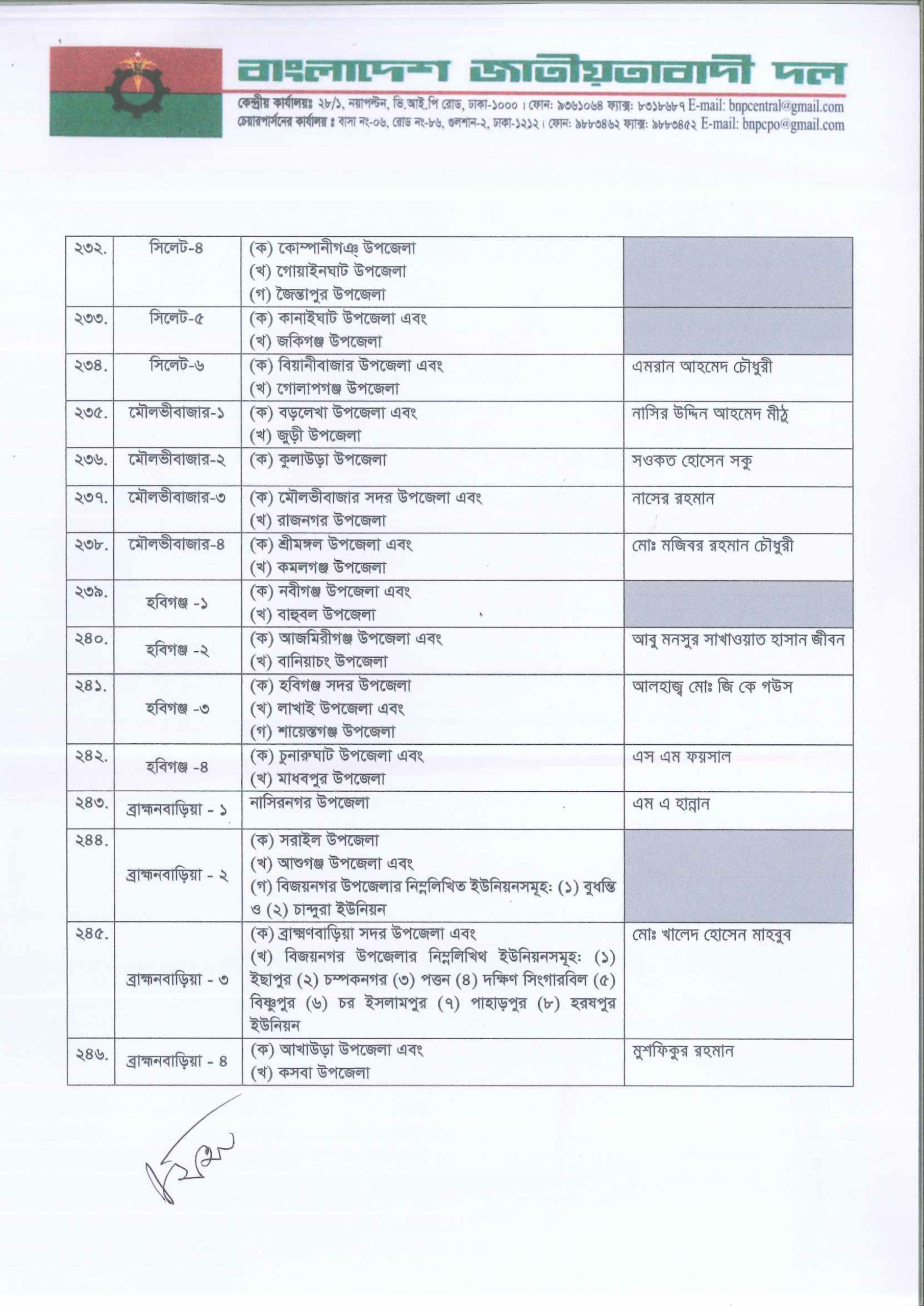 আসন্ন জাতীয় সংসদ নির্বাচনে ২৩২ আসনে সম্ভাব্য প্রার্থী তালিকা ঘোষণা করেছে বাংলাদেশ জাতীয়তাবাদী দল (বিএনপি)। সোমবার (৩ নভেম্বর) দুপুরে রাজধানীর গুলশানে বিএনপি চেয়ারপারসনের কার্যালয়ে আয়োজিত এক সংবাদ সম্মেলনে দলীয় প্রার্থীদের নাম ঘোষণা করেন মহাসচিব মির্জা ফখরুল ইসলাম আলমগীর।